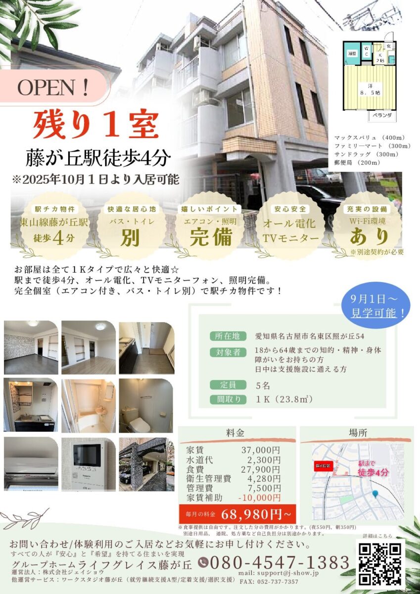 今月オープンした、弊社のグループホーム、ライフグレイス藤が丘の空室が残り1室となりました!入居をご検討されている方は、お気軽にお問い合わせくださいね!見学は随時受け付けております。藤が丘駅徒歩4分で、バス、トイレが別になっております。プライベート空間をお望みの方向けのグループホームです♪