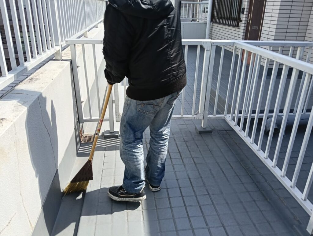 ホウキを使用してマンションの共用廊下や階段、駐車場や駐輪場、マンション周辺等を隅々まで掃きます。