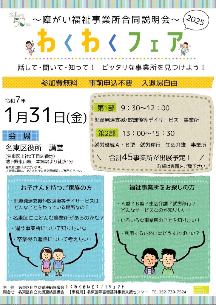 令和7年1月31日(金)、名東区役所の講堂にてわくわくフェアが開催されます! わくわくフェアは、予約や事前申込みは不要で、入退場も自由にできる障がい福祉事業所の合同説明会です。 今回は合計45事業所が出展予定で、名東区内の児童発達支援/放課後... -