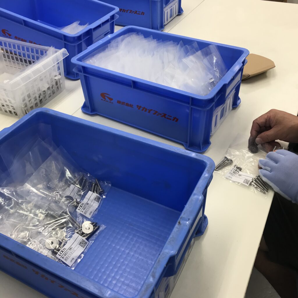 ワークスタジオの中で行っている軽作業の一つにネジの封入があります。袋にシールを貼って、ネジを組み立て、封入してホチキスで留め、100袋ずつ箱に詰めて出荷します。 数を間違えると納入先の現場で仕事が止まってしますので、簡単なようで責任重大なお...