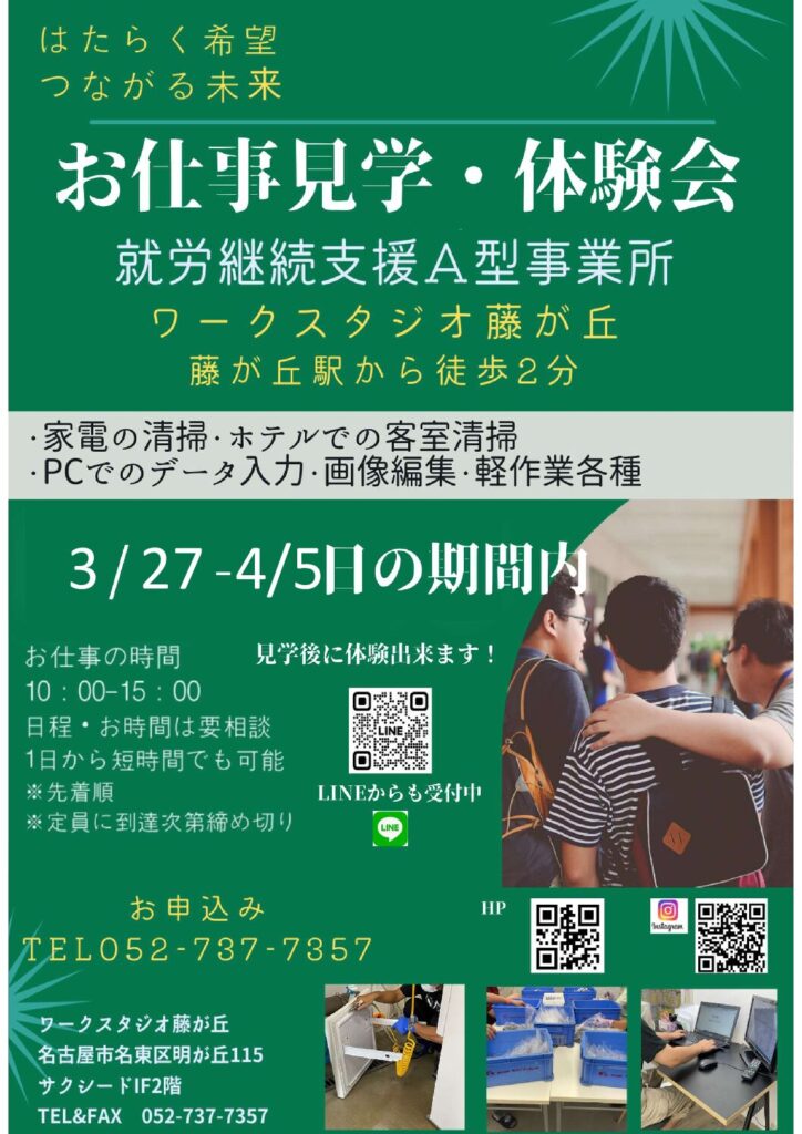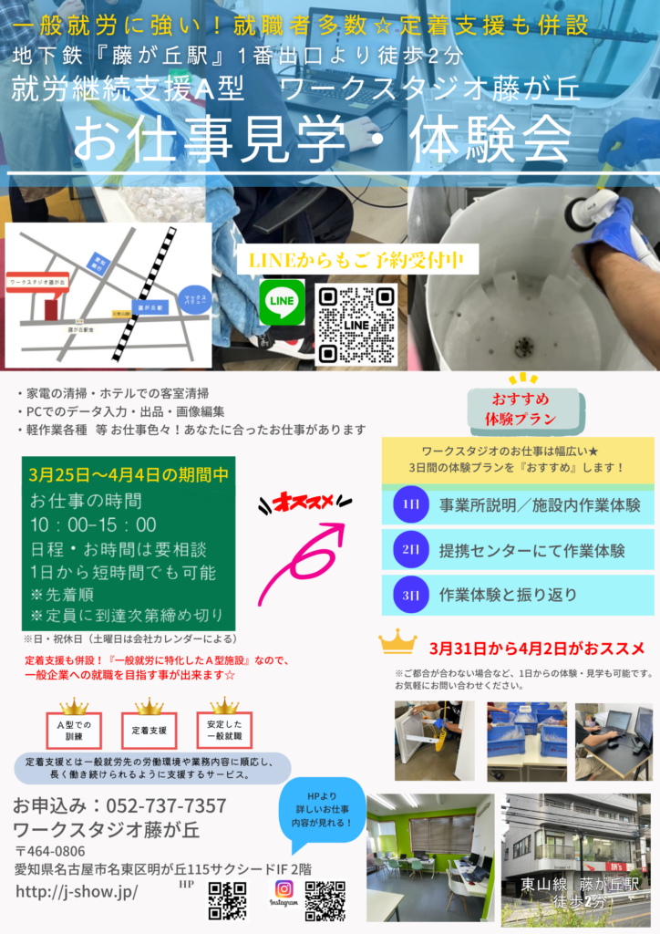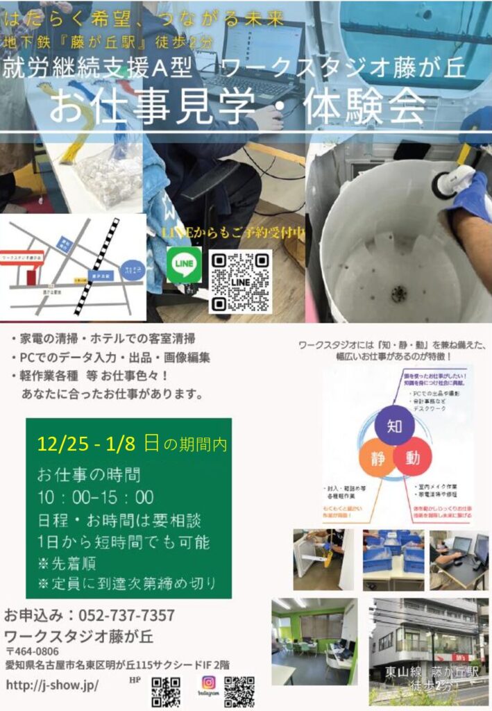 学校の冬休み期間中にお仕事体験会をを開催します♪先着順の予約制になります。 お仕事体験はもちろん、見学のみでも大歓迎☆ご興味のある方は、お電話、メール、LINEQRコードにてご連絡下さいm(__)m ワークスタジオ藤が丘は障害や難病のある方と雇用契約を... -
