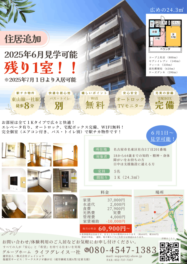 弊社で管理しているグループホーム、ライフスタジオ一社で3室の追加募集を始めます。 こちらのグループホームは、地下鉄一社駅徒歩8分と好立地のうえ、お風呂とトイレがそれぞれ独立した1Kタイプのお部屋となっております。また、wifi無料、エレベーター... -