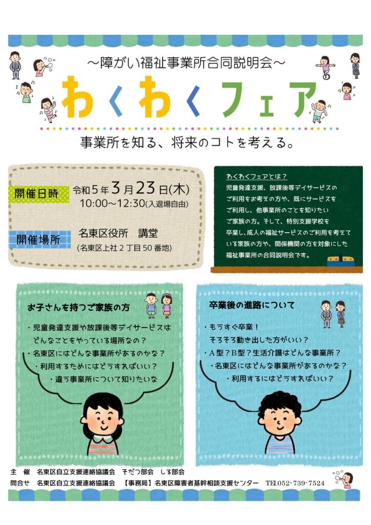 明日、3月23日(木)10時~名東区役所講堂にて、区内12カ所の児童発達支援・放課後等デイサービス事業所や5カ所の障害福祉サービス事業所が参加する、福祉事業所の合同説明会が開かれます。弊社も参加していますので、興味のある方は是非、お越しくださいm...
